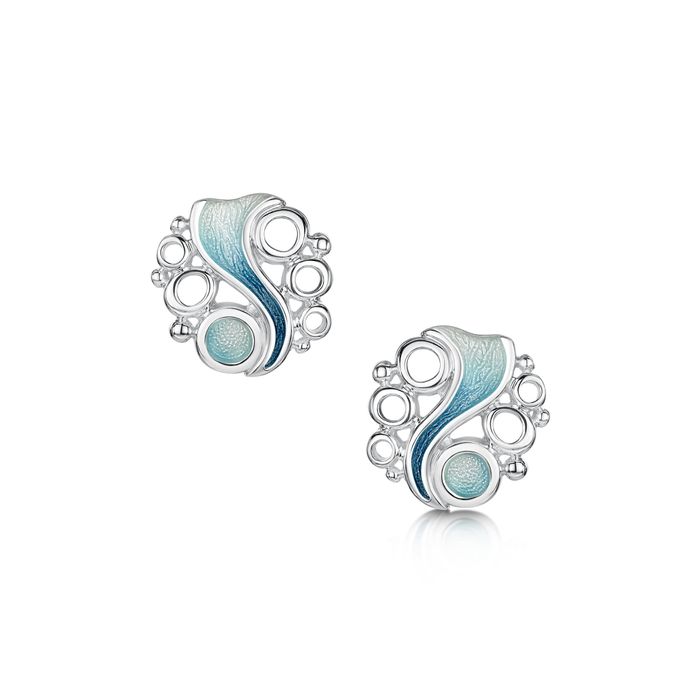 These Arctic Stream stud earrings in sterling silver feature an ice, rock and flowing water design, beautifully highlighted in Sheila's 'Arctic Blue' enamel. Each earring is approximately 15mm in diameter.
