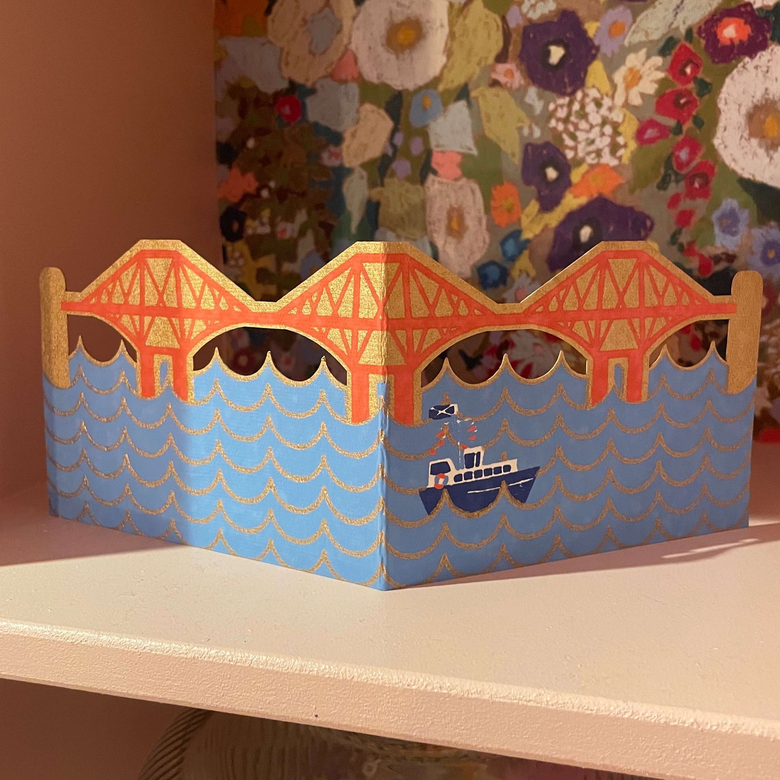 Forth Bridge fold-out, screen-printed greetings card. Each card is printed by hand on both sides of thick recycled cotton and comes with its own hand-printed envelope, making every piece a little work of art.