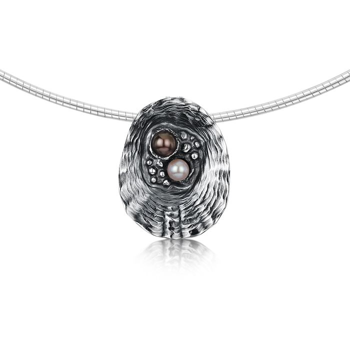 This large Limpet necklace in oxidised sterling silver features two pearls—black and peach—delicately hand-set in our Orkney workshop. The design measures approximately 20mm by 25mm and hangs from a silver neckwire.