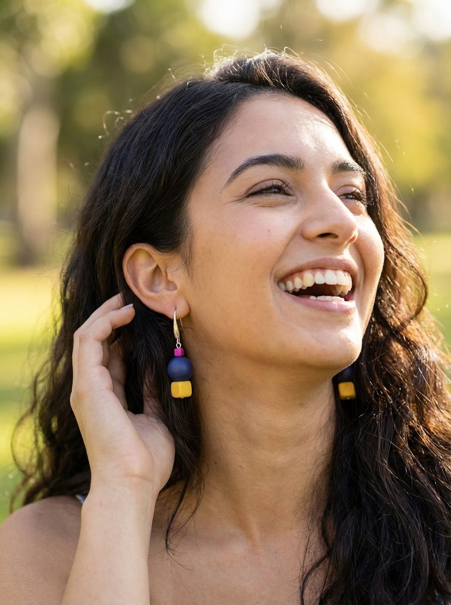 These vibrant earrings showcase the natural beauty of tagua, often called “vegetable ivory,” sustainably sourced from South American palm nuts. Each earring features a playful stack of bold, hand-carved beads in rich navy, bright fuchsia, and sunny yellow, creating a modern, eye-catching color combination. Lightweight, smooth to the touch, and polished to a soft matte finish, they offer comfortable all-day wear while making a joyful style statement. Perfect for conscious consumers, these earrings blend ethical craftsmanship with contemporary design—ideal for boutiques, gift stores, and lifestyle retailers looking to add eco-friendly elegance with personality.