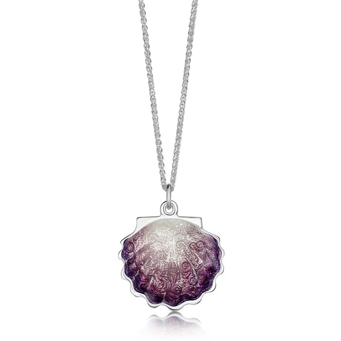 This medium Scallop pendant is hand-enamelled in Scallop Pink enamel and is attached to a silver curb chain. The pendant can be worn to show the shell's enamelled interior or reversed to show its intricate, carved exterior. This beautiful piece measures approximately 23mm by 23mm and is hand-finished in our Orkney workshop.