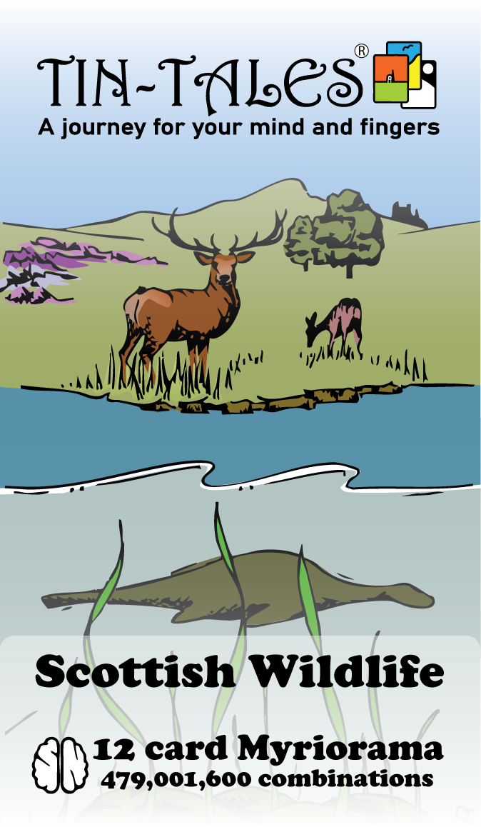 A wildlife Myriorama featuring a selection of Scotland's most popular fauna consisting of 12 cards that can be arranged into 479,001,600 panoramic landscape combinations. An explanatory leaflet and helpful prompts on the back of each card can be used to inspire your imagination and help you create your own stories. Contained in a tactile 65mm x 110mm x 16mm tin with sliding lid, this affordable pocket-sized curio is an ideal gift or souvenir for those on a quest to find something uniquely different. Hand-illustrated, locally produced and fully recyclable.