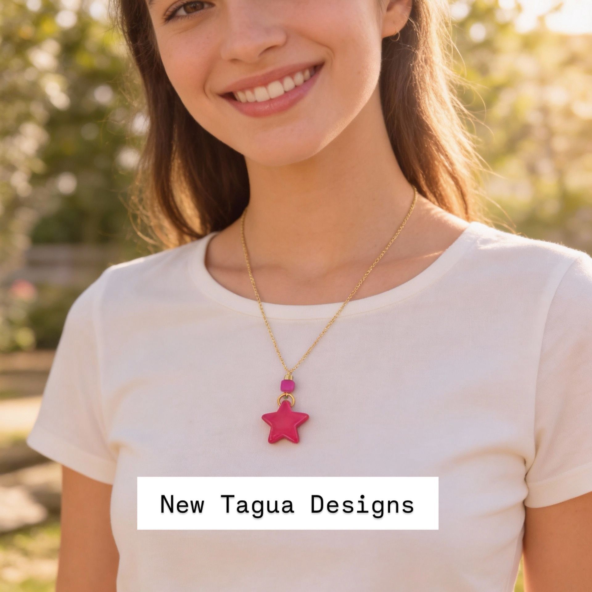 This charming necklace brings a playful pop of colour to any collection while celebrating sustainable craftsmanship. The bold star-shaped pendant is handcrafted from natural tagua, also known as “vegetable ivory,” an eco-friendly material sourced from South American palm nuts. Dyed a vibrant pink and polished to a smooth finish, it hangs beautifully from a delicate gold-toned chain, creating a fresh, modern look that’s light, cheerful, and easy to wear every day. Perfect for gift shops, lifestyle retailers, and ethical fashion boutiques, this necklace blends joy, style, and conscious design in one standout accessory.